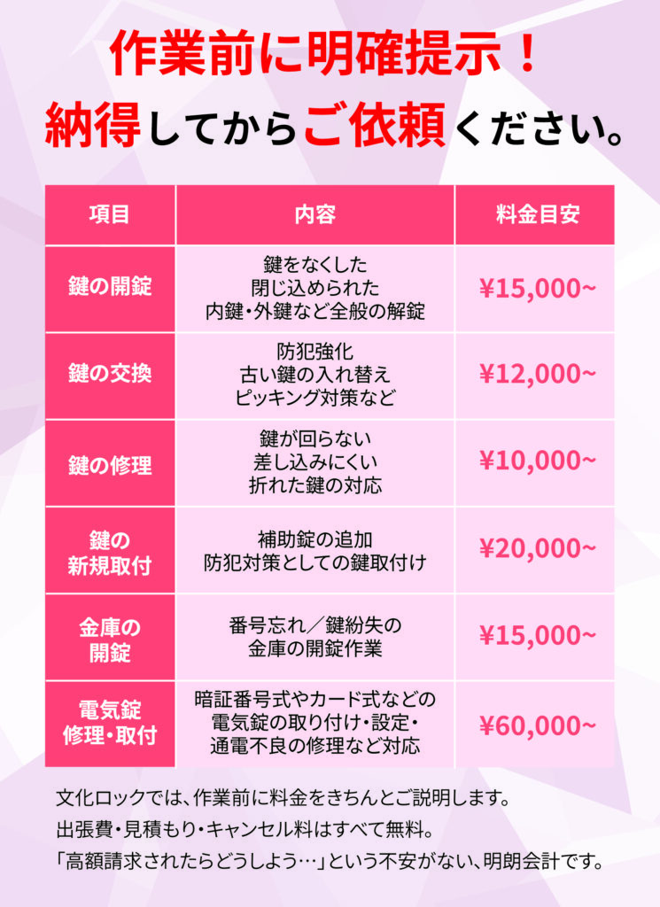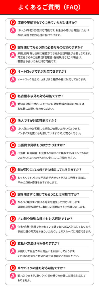 文化ロックは名古屋市を拠点に、愛知県全域で鍵の開錠、交換、修理などあらゆる鍵トラブルに迅速に対応しています。